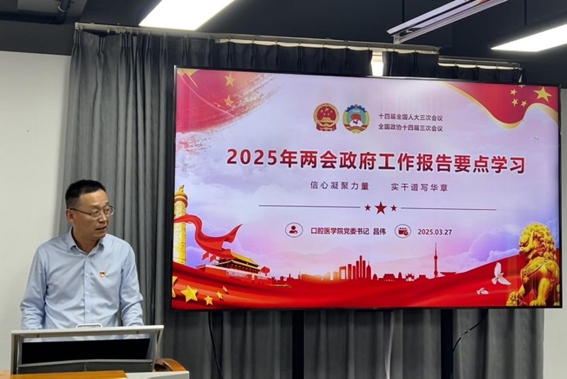 昌伟从“2024年工作回顾”“2025年经济社会发展总体要求和政策取向”“2025年政府工作任务”三个方面向同学们解读2025年政府工作报告,指出过去一年我国工作的整体基调为“稳”和“进”,以及今年发展主要预期目标和十大工作任务。书记继续指出,暨南大学口腔医学院在过去一年工作中在学院学科建设和专业建设、教学科研实践、社会实践、学生培养等方面成绩斐然,正积极为国家实施科教兴国战略、乡村振兴战略贡献力量,这离不开全院师生的共同努力奋斗。在最后,他鼓励同学们珍惜大学时光,努力学习专业知识,提升自己的综合素质和能力水平;同时主动关注国家大事、关心社会发展,增强社会责任感和使命感,坚定理想信念,积极投身社会实践。