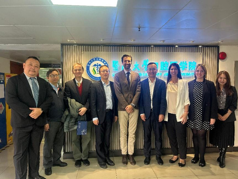 2026年1月19日,西班牙CEU圣保罗大学基金会代表团访问暨南大学口腔医学院。代表团成员包括西班牙CEU圣保罗大学基金会国际事务处处长ALFONSO DIAZ、西班牙CEU卡德纳尔埃雷拉大学国际化与研究生教育副校长Vicente Villar、口腔医学院院长Alba Jover Cervero及附属口腔医院行政院长Cristina Agueda Tome。暨南大学医学部副主任王颖、口腔医学院院长黄跃、党委书记昌伟、副书记王海兰、副院长谢思明共同会见来宾并出席了交流活动。